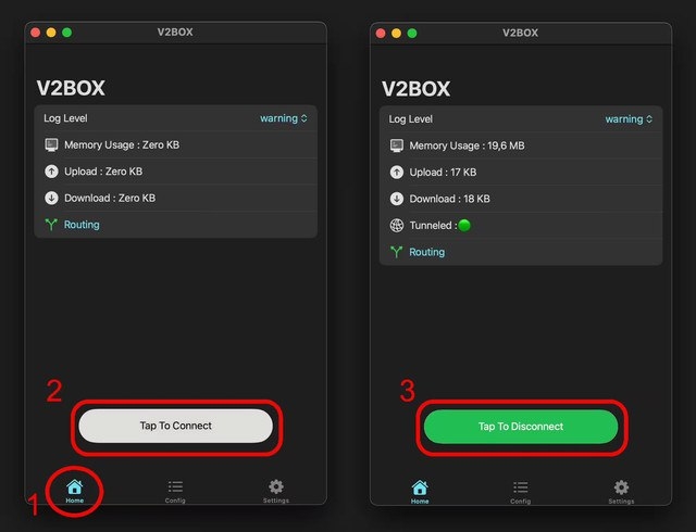 The tunnel will appear in the list. To enable it, go back to the Home tab (1) and click the Tap to Connect button (2). To disable the VPN, click the same button again (3).